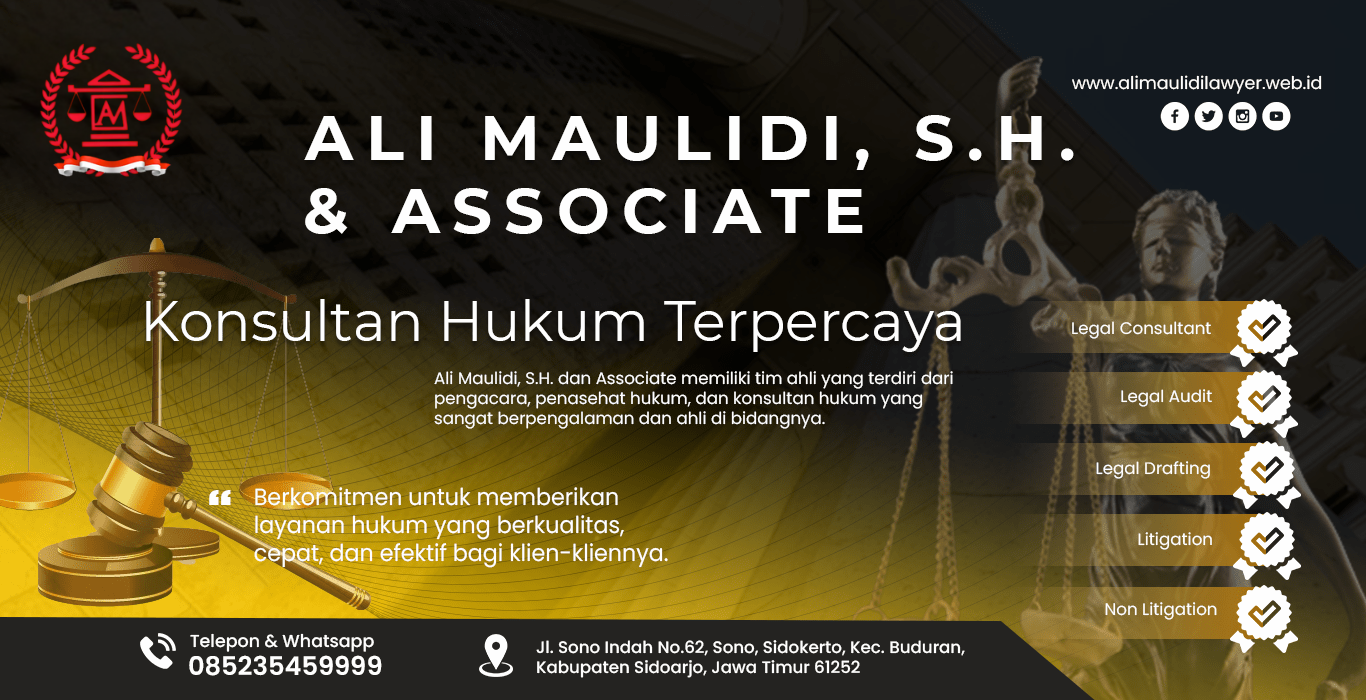 Ali Maulidi, S.H. dan Associate adalah sebuah firma konsultan hukum yang berbasis di Jl. Sono Indah No.62, Sono, Sidokerto, Kec. Buduran, Kabupaten Sidoarjo, Jawa Timur 61252. Ali Maulidi, S.H. dan Associate memiliki tim ahli yang terdiri dari pengacara, penasehat hukum, dan konsultan hukum yang sangat berpengalaman dan ahli di bidangnya.